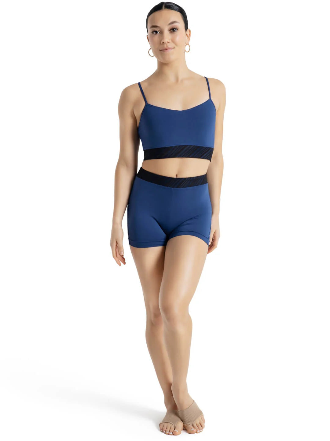 Stay active all day in the Rio Boy Short! This pull-on, high-waisted short will soon become your favorite, as they are perfect for every class and rehearsal. Black line-patterned mesh overlay on waistband for added detail. Pair with any leotard or top from the Metro Moves collection to complete your look. Available in adult sizes only.