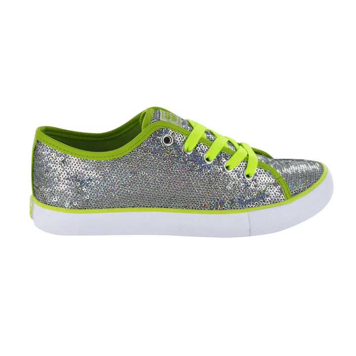 Exhibit your style in these sparkly high top statement sneakers with highlighted neon outline. The canvas lining absorbs moisture and is washable to maintain good hygienic conditions. The rubber outsole of silver sequin sneakers delivers flexibility from the first wear, rubber naturally has more shock absorption, so you don't feel the hardness if you dance.