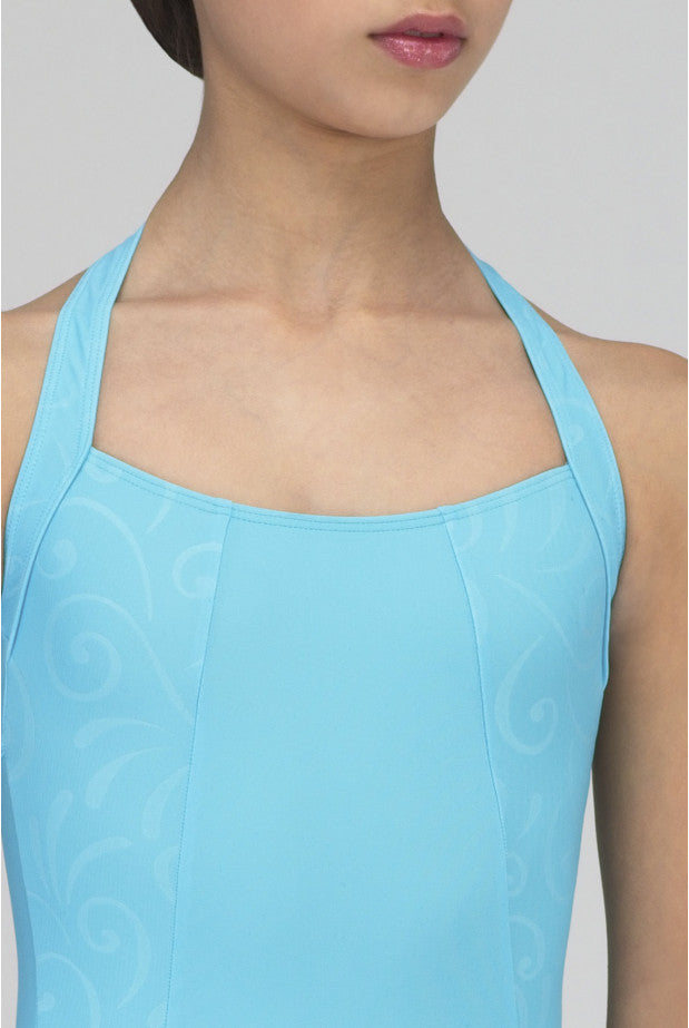 A halter leotard with embossed microfiber details, featuring flattering princess seams and open shoulder blades. This unique leotard will help you take center stage.